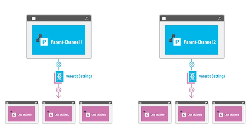 Hinter der „Multi-Channel-Konfiguration“ steckt ein klares Konzept. Es gibt zwei Arten von Channel-Typen, die Sie in FACT-Finder erstellen und konfigurieren können: Parent- und Child-Channels. Die Parent-Channels übergeben ihre Settings – das heißt Suchoptimierungen, Grundeinstellungen und Moduleinstellungen – automatisch an die mit ihnen verknüpften Child-Channels. Schematisch sieht das so aus: